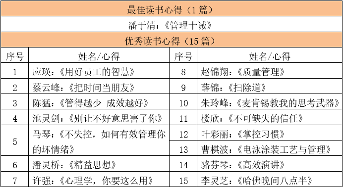 本次為2019年第三季度讀書(shū)心得評(píng)選活動(dòng),經(jīng)總裁辦校對(duì)、審核,從100多篇心得中初選出30篇,再根據(jù)主題明確、立意新穎、結(jié)合工作實(shí)際、文字通順完整等篩選出16篇優(yōu)秀心得,其中獲得本季度“最佳讀書(shū)心得”得主品質(zhì)部潘于清的《管理十誡》評(píng)選。最佳及優(yōu)秀文稿如下: