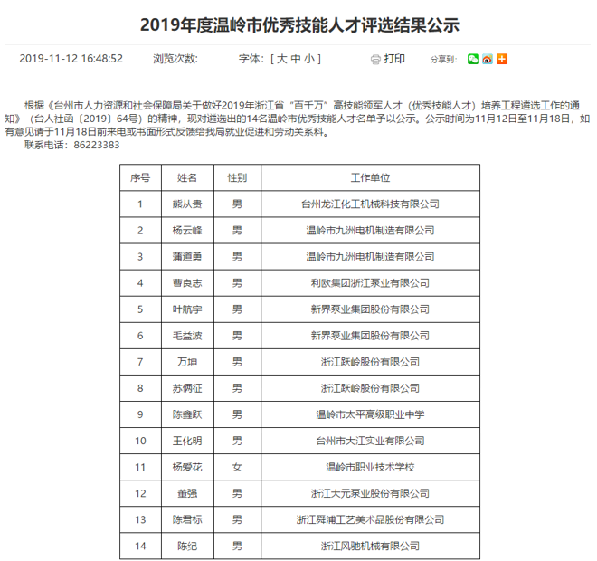 為高水平建設(shè)人才強(qiáng)省,進(jìn)一步加快高技能人才隊(duì)伍建設(shè),我司根據(jù)《臺(tái)州市人力資源和社會(huì)保障局關(guān)于做好2019年浙江省“百千萬”高技能領(lǐng)軍人才培養(yǎng)工程遴選工作的通知》要求,通過我司推薦,經(jīng)資格初審、評(píng)委會(huì)評(píng)審等環(huán)節(jié),我司研發(fā)中心陳紀(jì)被評(píng)選為溫嶺市優(yōu)秀技能人才,并在網(wǎng)上予以公示,符合公司的價(jià)值觀 “客戶為先、誠(chéng)信負(fù)責(zé)、團(tuán)隊(duì)合作、務(wù)實(shí)創(chuàng)新”精神。