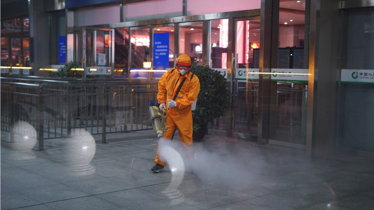 呂有谷和隊(duì)友們戴著背負(fù)式彌霧器一起上陣,在動(dòng)車站大廳、售票處、衛(wèi)生間等區(qū)域進(jìn)行了全方位、無(wú)死角消毒滅茵。在近兩個(gè)小時(shí)的消毒作業(yè)過(guò)程中,防