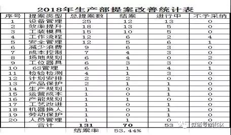 2018年,生產(chǎn)部各車(chē)間合計(jì)提案改善131件,完結(jié)70件,推進(jìn)中53件,不予采納8件。大家的提案,涉及到生產(chǎn)管理的方方面面,非常廣泛。