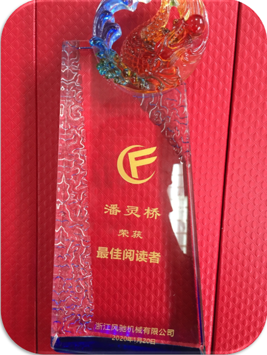 通過對四個季度最佳及優(yōu)秀心得匯總,經(jīng)公司領(lǐng)導(dǎo)層最終評選生產(chǎn)部潘靈橋為2019年度“最佳閱讀者”,并授予該榮譽獎杯。